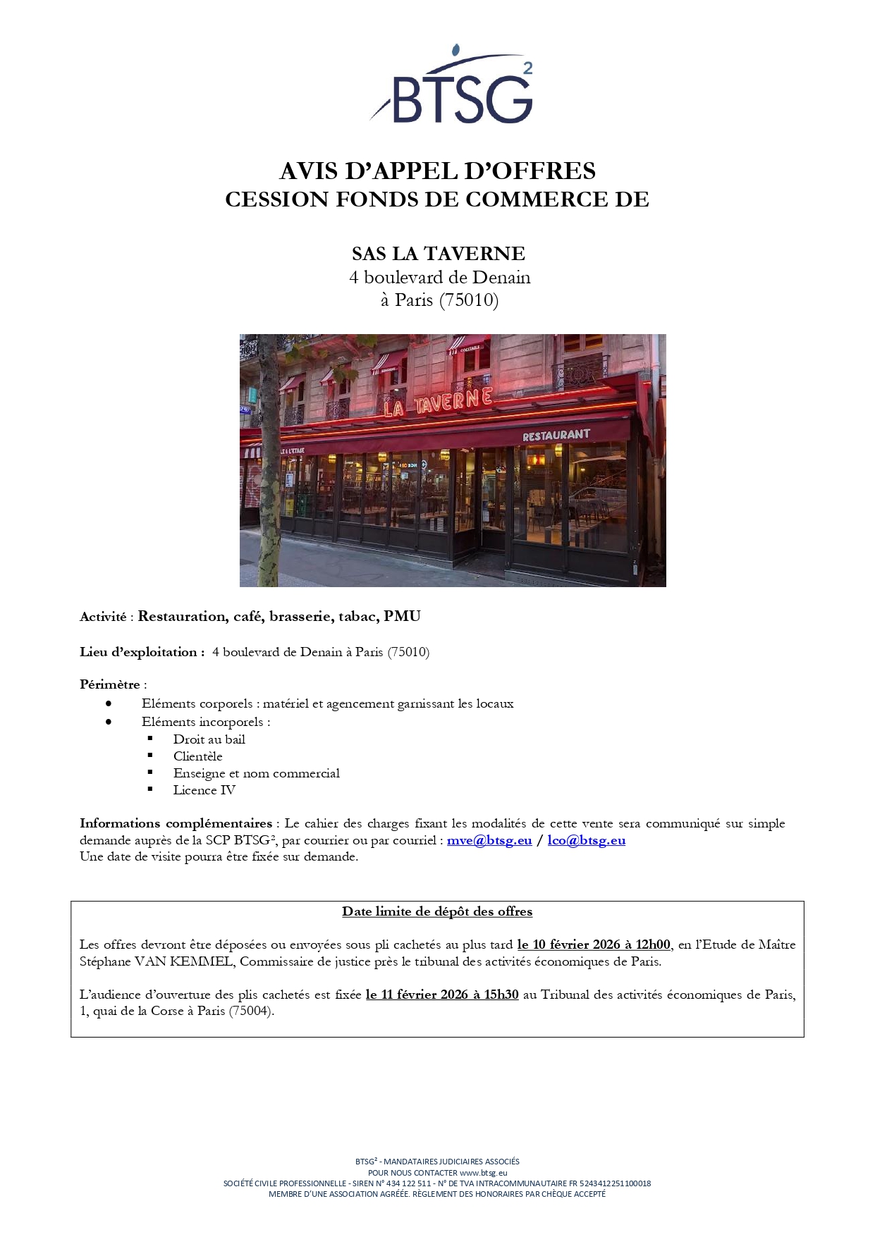 Périmètre : - Droit au bail portant sur des locaux situés 4 boulevard de Denain à Paris dans le 10ème de 360m², - Clientèle et achalandage, - Le nom de l'enseigne "LA TAVERNE", - La licence IV, - Les éléments corporels inventoriés par le Commissaire de Justice et appartenant en propre à la société LA TAVERNE.